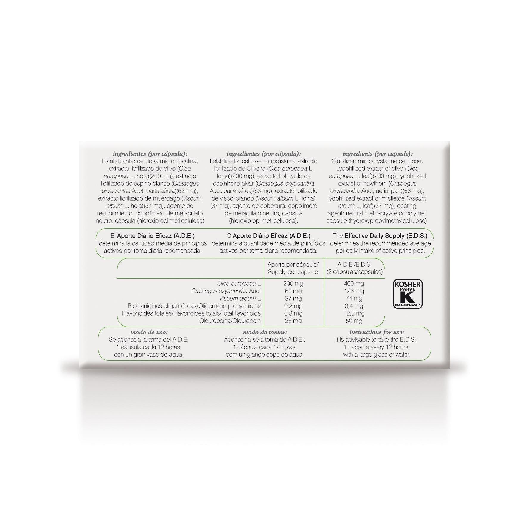 (pro Kapsel) Stabilisator: mikrokristalline Cellulose, gefriergetrockneter Extrakt aus Olivenbaum (Olea europaea L, Blatt) (200 mg), gefriergetrockneter Weißdorn-Extrakt (Crataegus oxyacantha Auct, oberirdischer Teil) (63 mg), gefriergetrockneter Mistelextrakt (Viscum album L, Blatt) (37 mg), Überzugsmittel: neutrales Methacrylat-Copolymer, Kapsel (Hydroxypropylmethylcellulose).