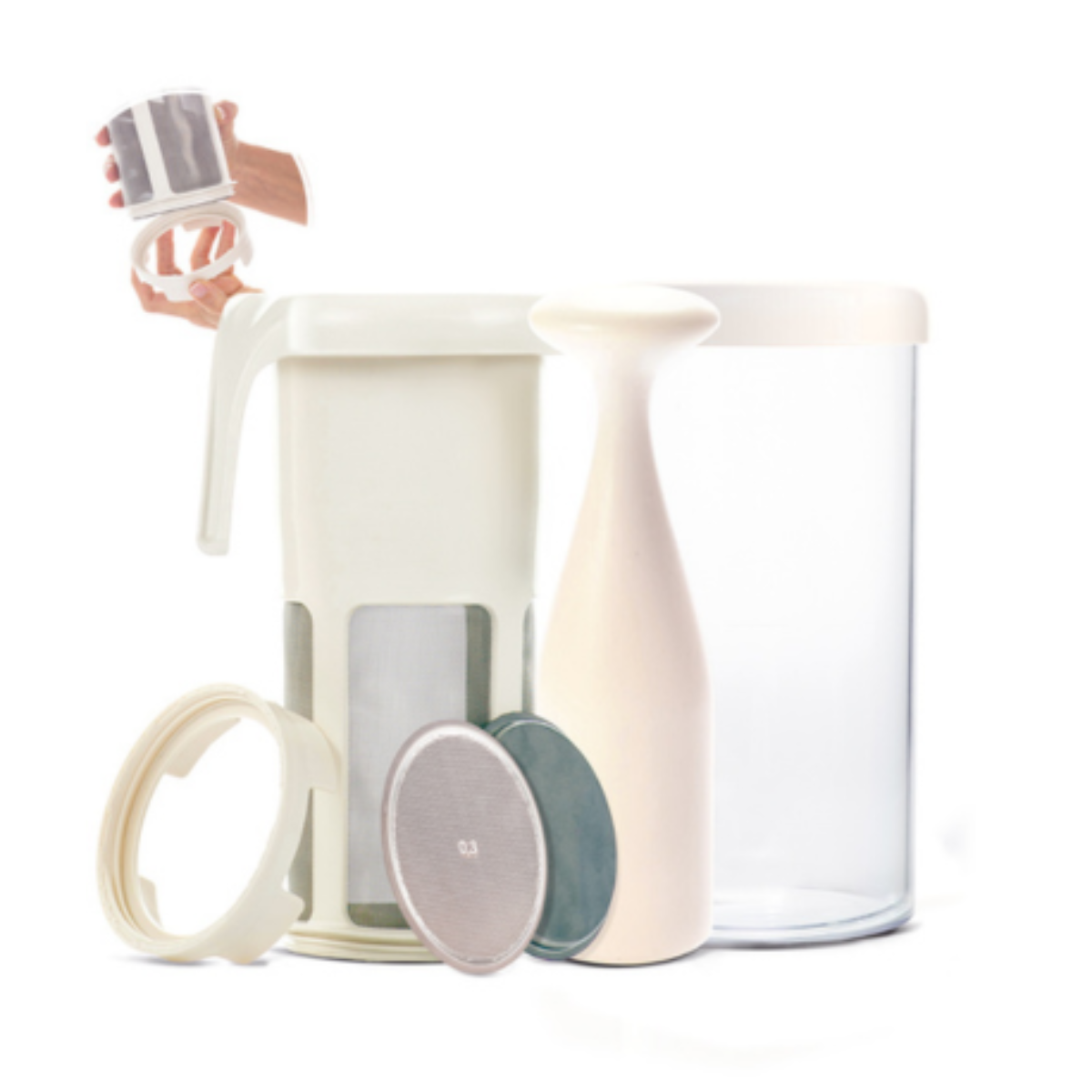 Besteht aus 6 stapelbaren Teilen: abschraubbarer Filter, 2 austauschbare Scheiben, Mörser, Behälter und Deckel sowie ein E-Book Rezepte.