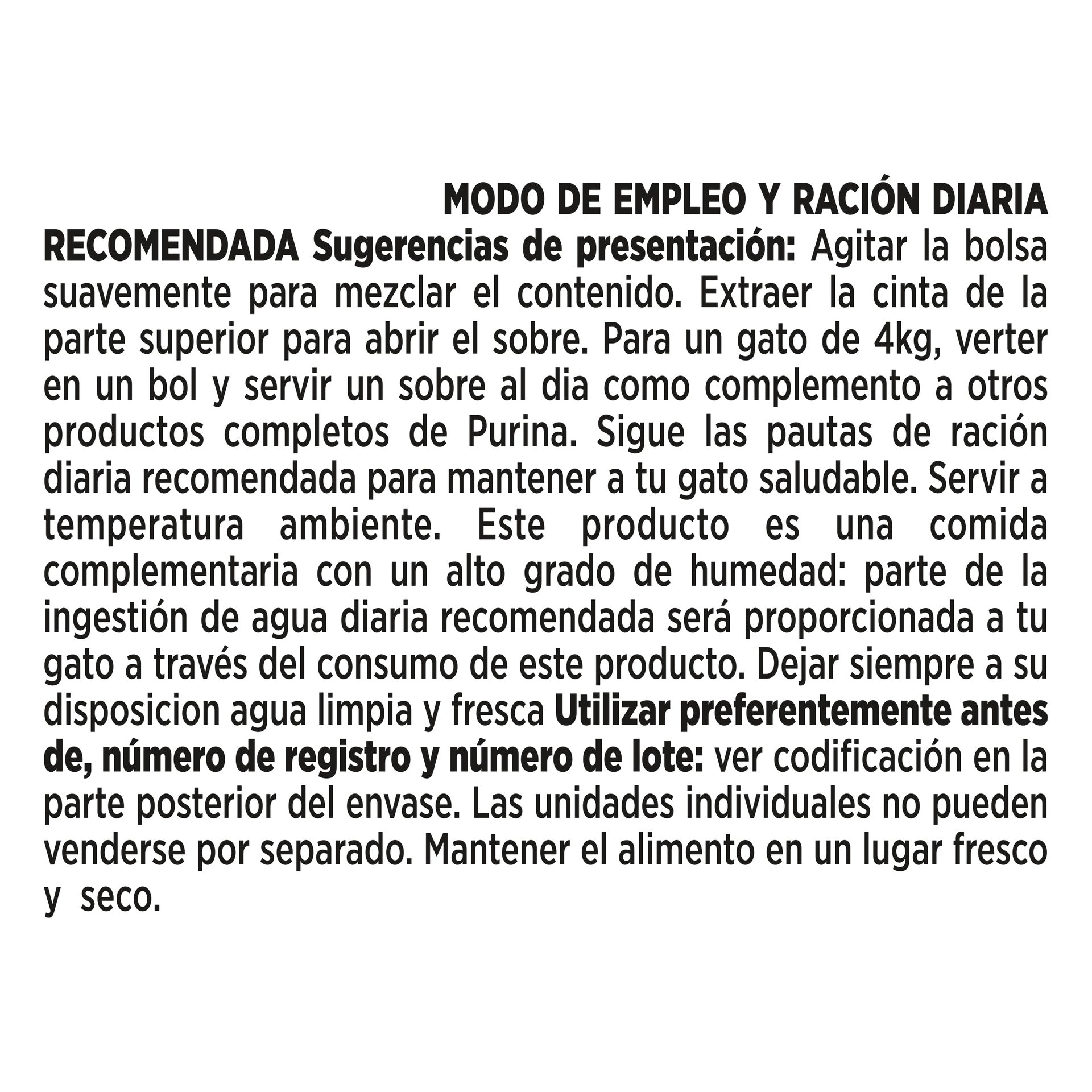 Para un gato de 4 kg, verter en un bol y servir un sobre al día como complemento a otros productos completos de Purina.