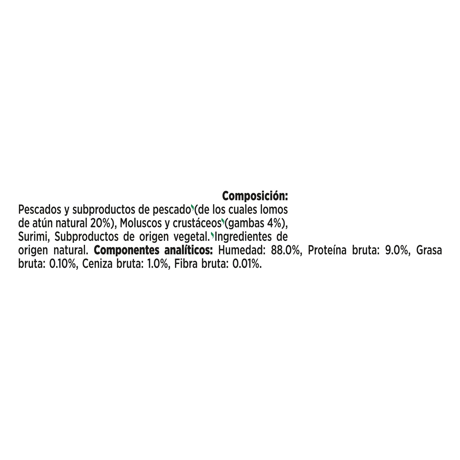 Composición: Pescados y subproductos de pescado* (de los cuales lomos de atún natural 20%), moluscos y crustaceos* (gambas 4%),