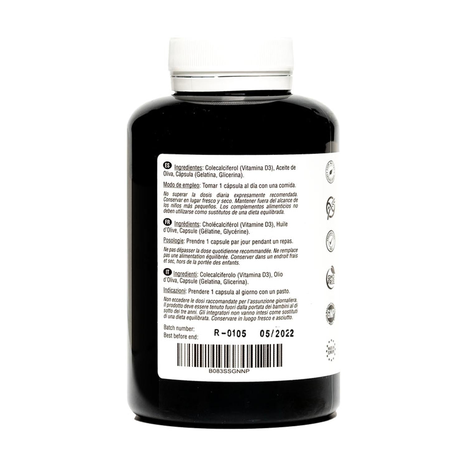 Colecalciferol (Vitamina D3), Aceite de Oliva, Cápsula (Gelatina, Glicerina).