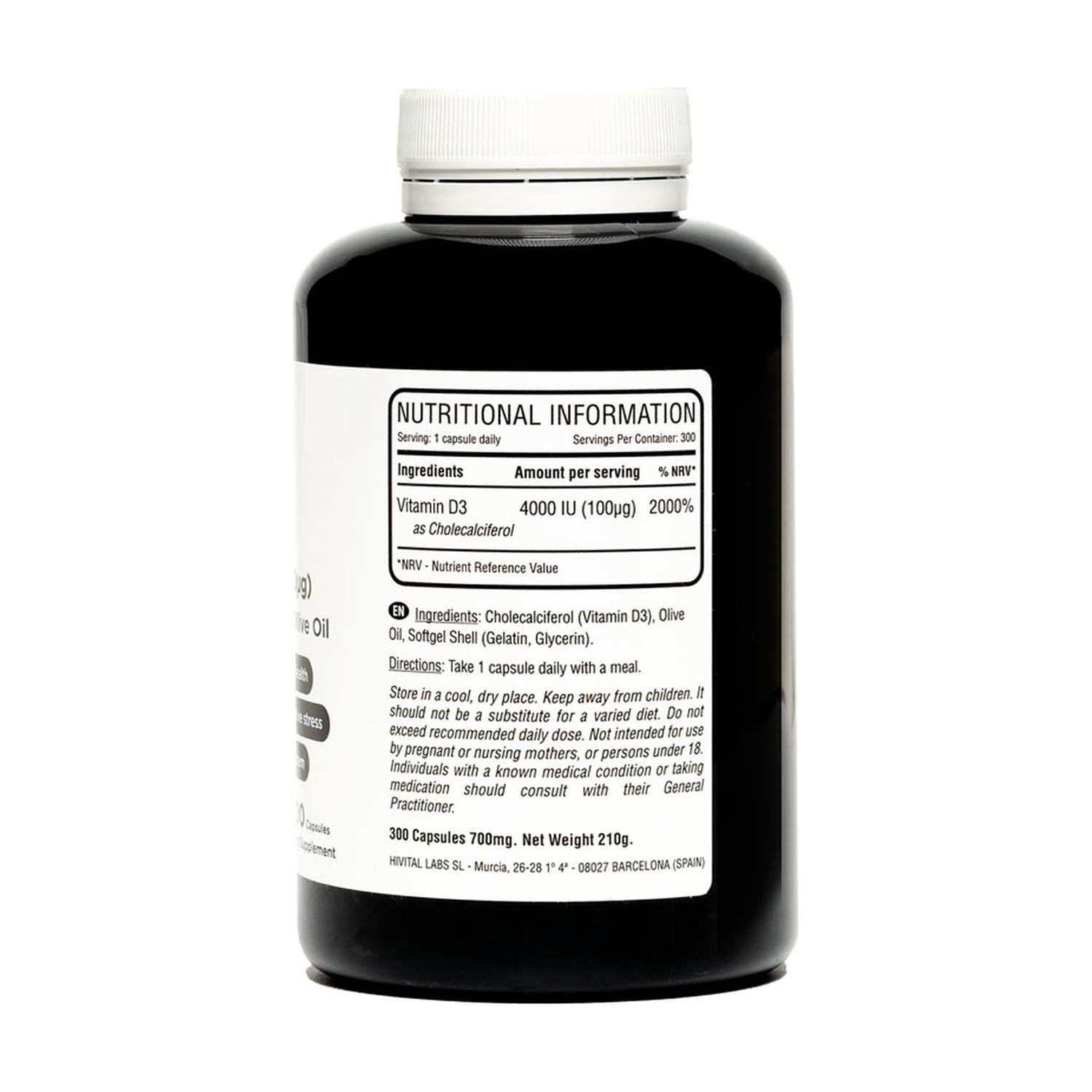 Fórmula a base de vitamina D3 pura en su forma colecalciferol y aceite de oliva virgen extra. La vitamina D mantiene los huesos, las articulaciones y los dientes sanos, mejora la función muscular y el sistema inmunológico, y contribuye a la absorción normal de calcio y fósforo.