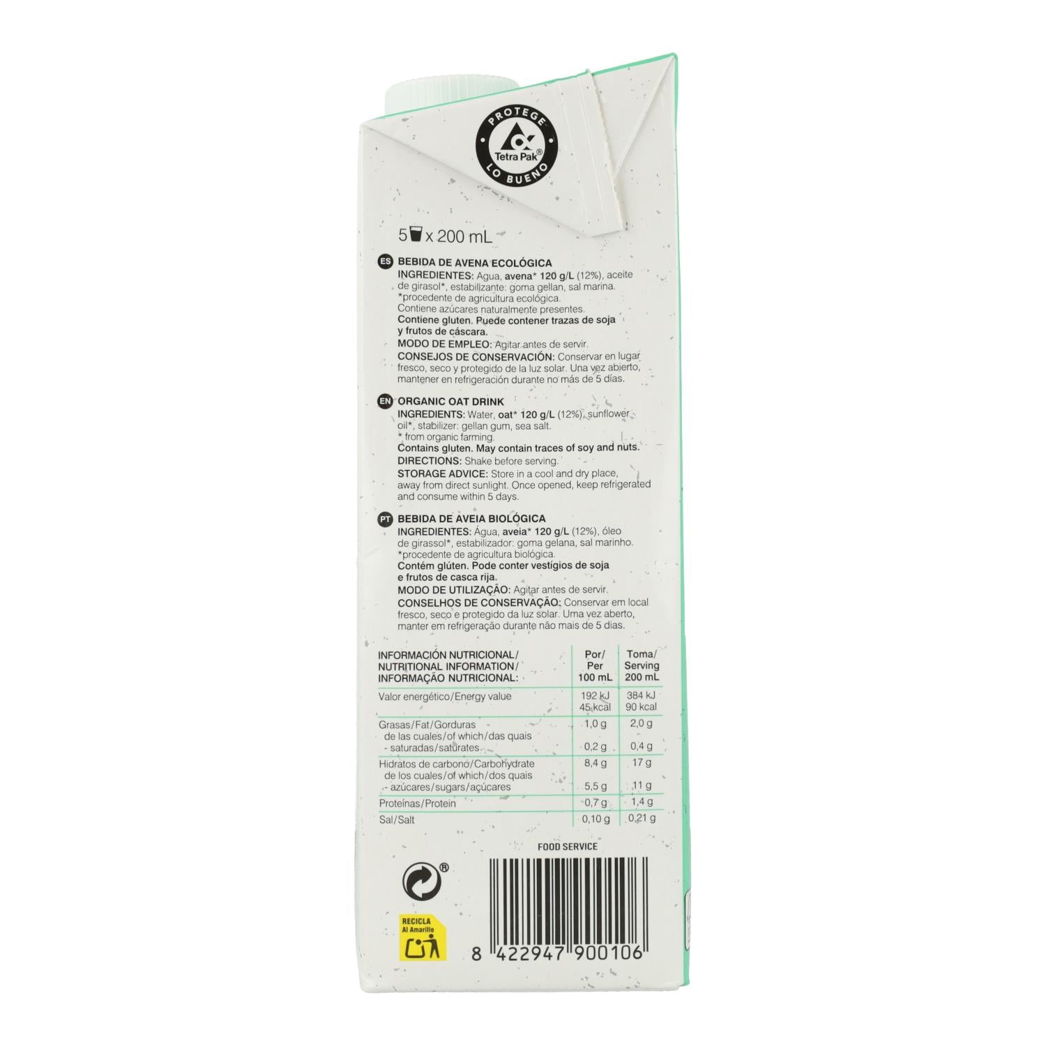 Envase de 1 litro (Tetra Pak, 87% origen vegetal).