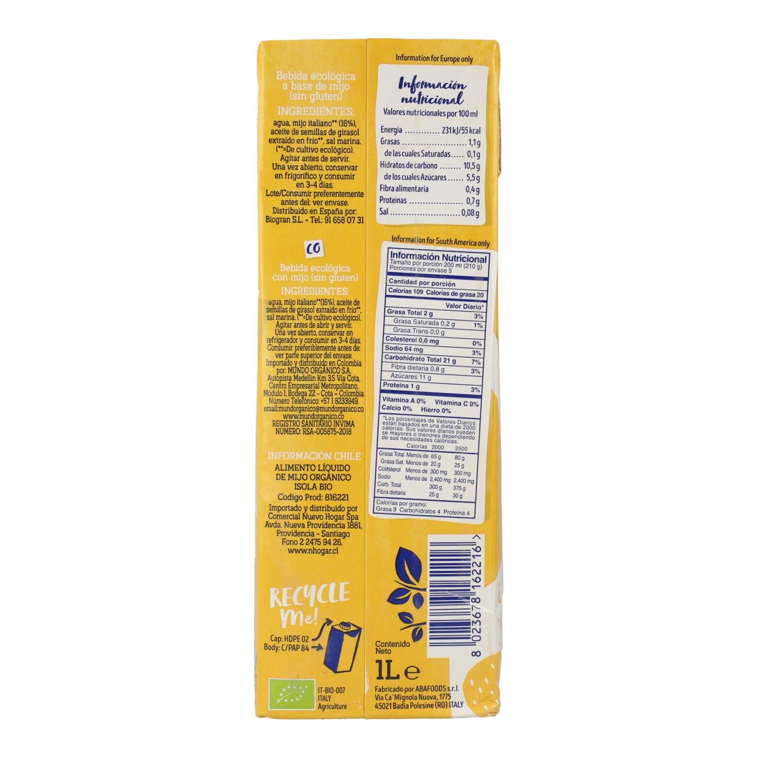La Bebida de Mijo Isola Bio se produce con mijo Italiano, certificado ecológico y proveniente de la Sociedad Agrícola "La goccia".