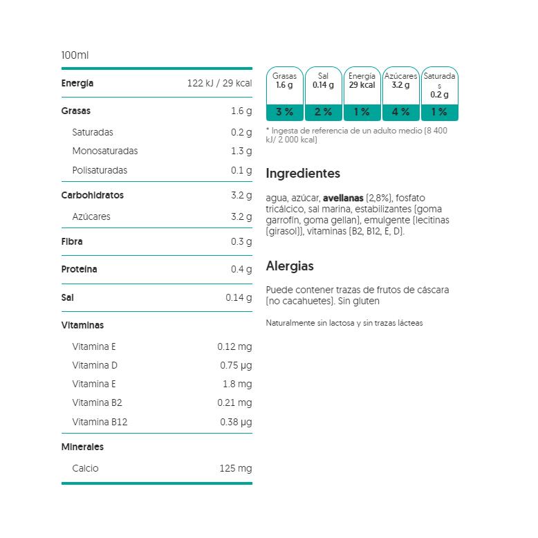 Ingrédients : eau, sucre, noisettes (2,8 %), phosphate tricalcique, sel marin, stabilisants (gomme de caroube, gomme gellane), émulsifiant (lécithines de tournesol), vitamines (B2, B12, E, D2). Peut contenir des traces de fruits à coque (sans arachides).