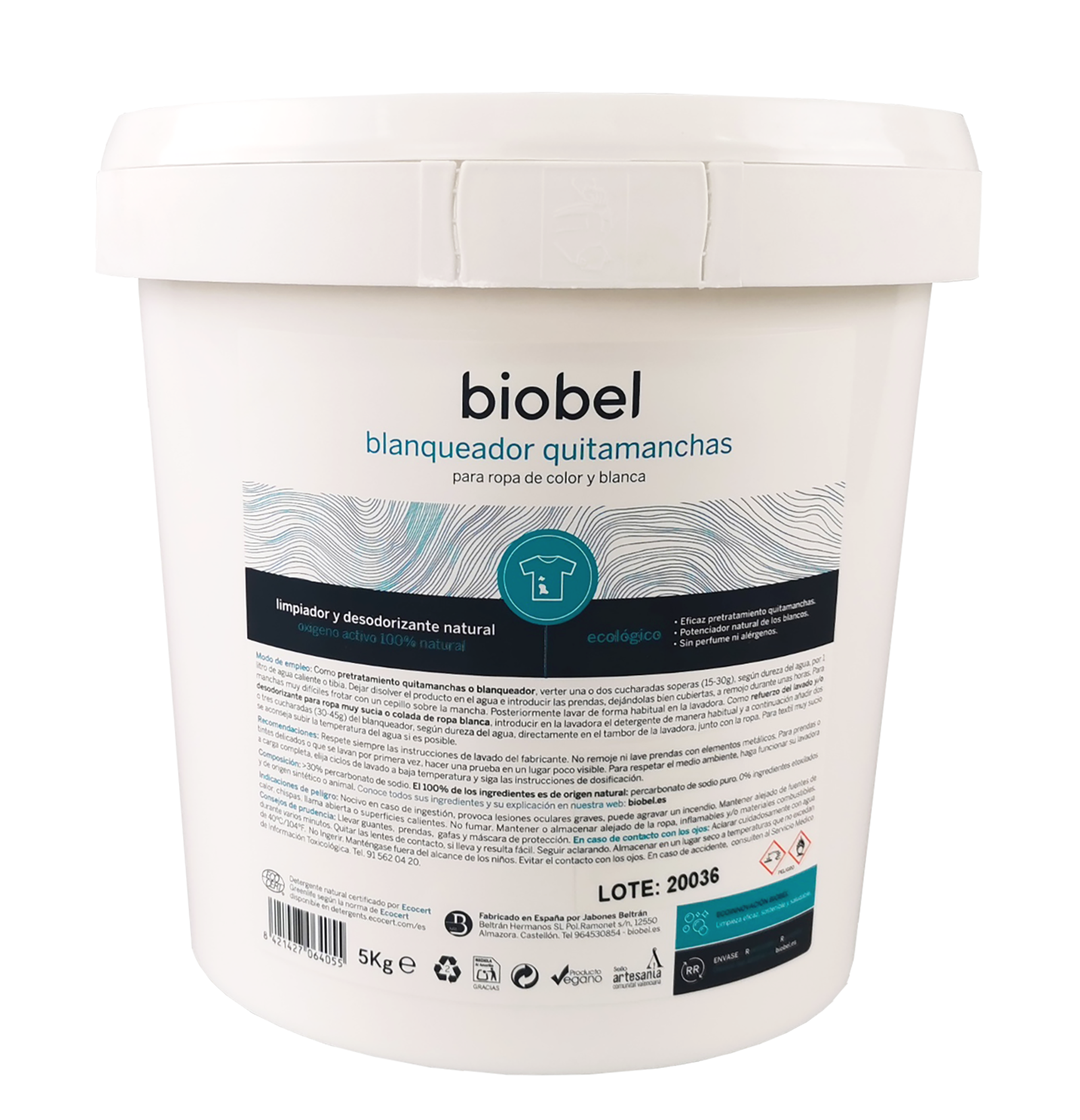 Biobel Bleach est un détachant, blanchissant, désinfectant et désodorisant naturel puissant à base de percarbonate de sodium, également appelé oxygène actif. C'est l'alternative écologique idéale pour raviver l'éclat du linge blanc et clair. Sans javel, chlore, parfum ni allergènes, il est certifié EcoCert comme produit de nettoyage écologique.