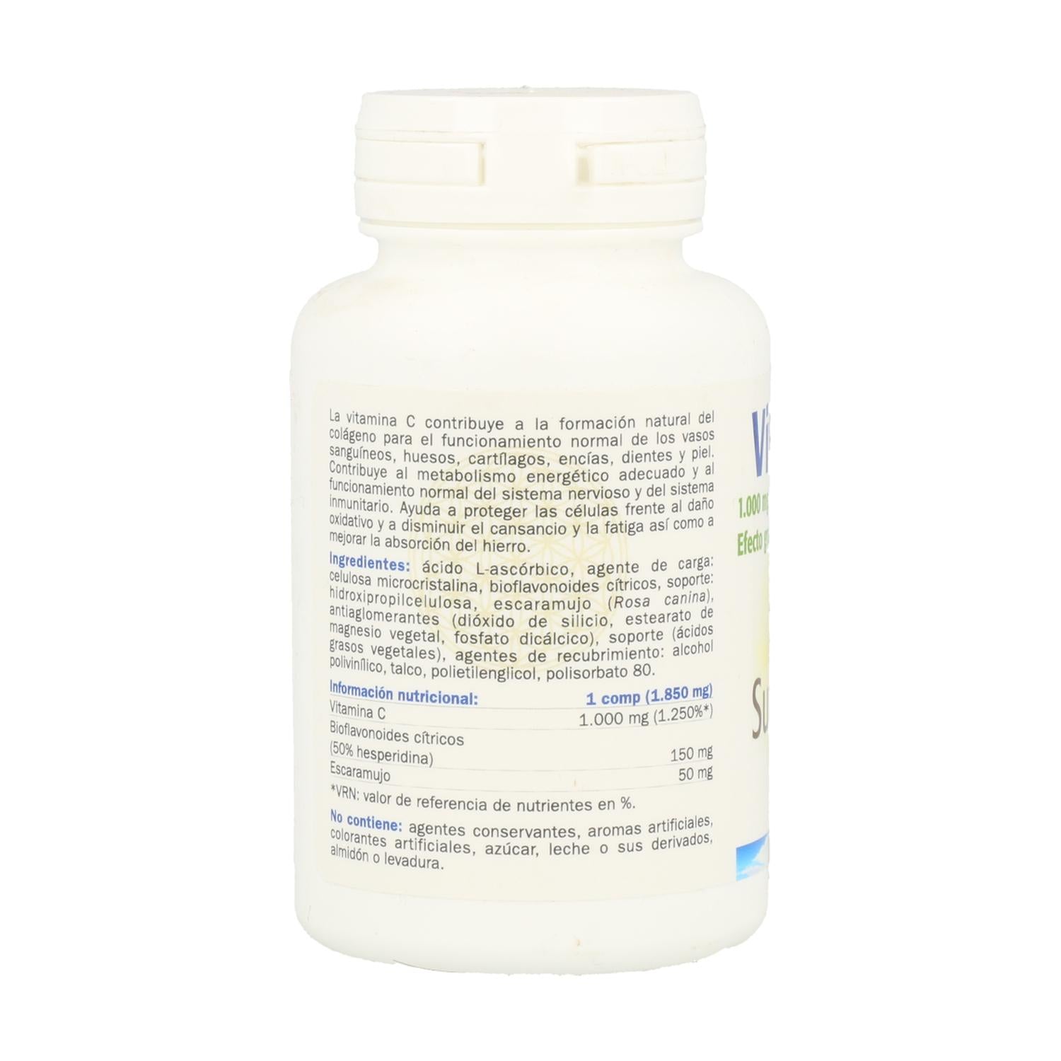 Vitamine C (acide L-ascorbique), cellulose microcristalline, acide stéarique végétal, stéarate de magnésium végétal, dioxyde de silicium.