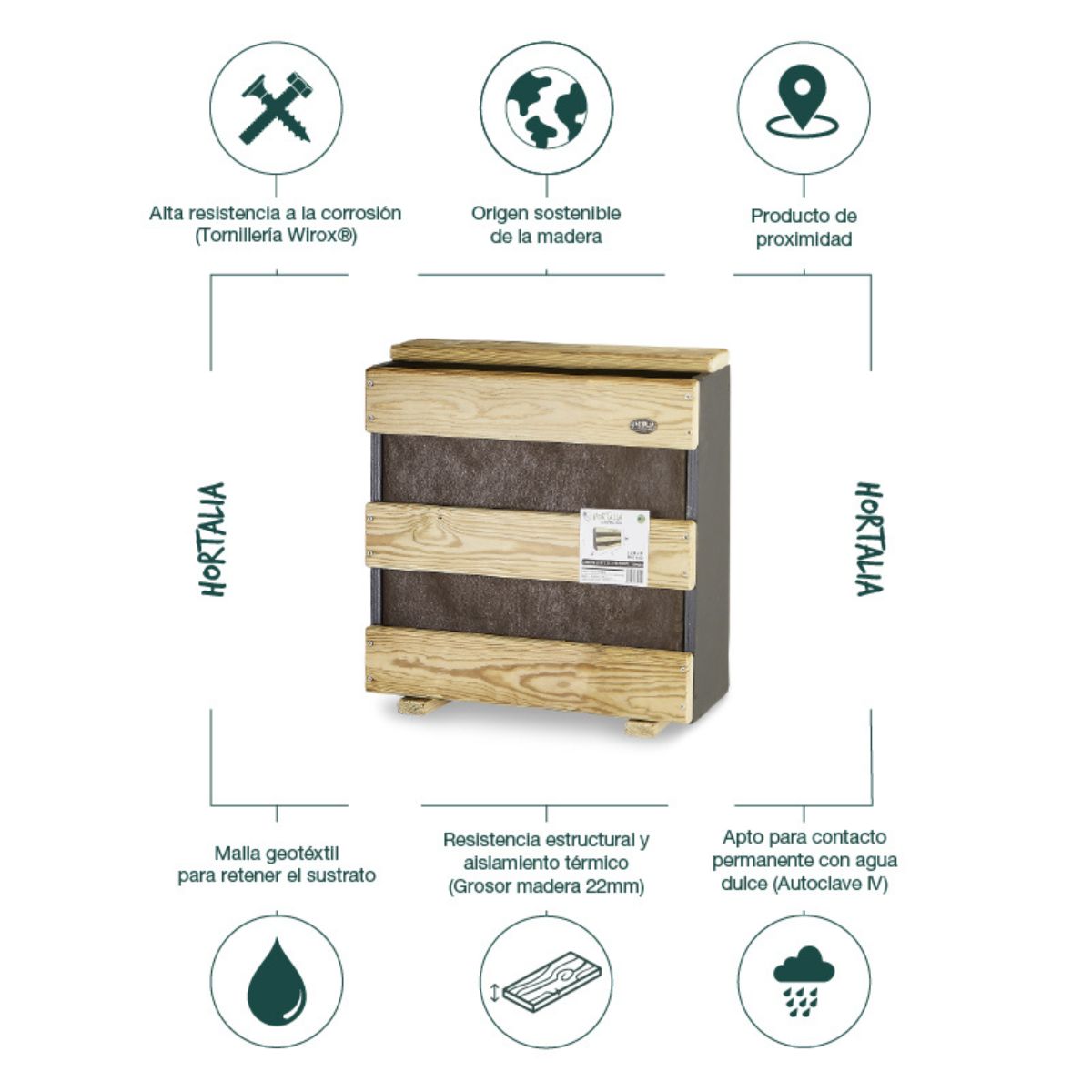 Este modelo nos permite tres marcos de plantación: dos en la cara horizontal y uno en la parte superior. Además, ya viene montado, con la malla geotextil colocada en su interior. Listo para poner el sustrato, semillas o plantel y ¡empezar a disfrutar!