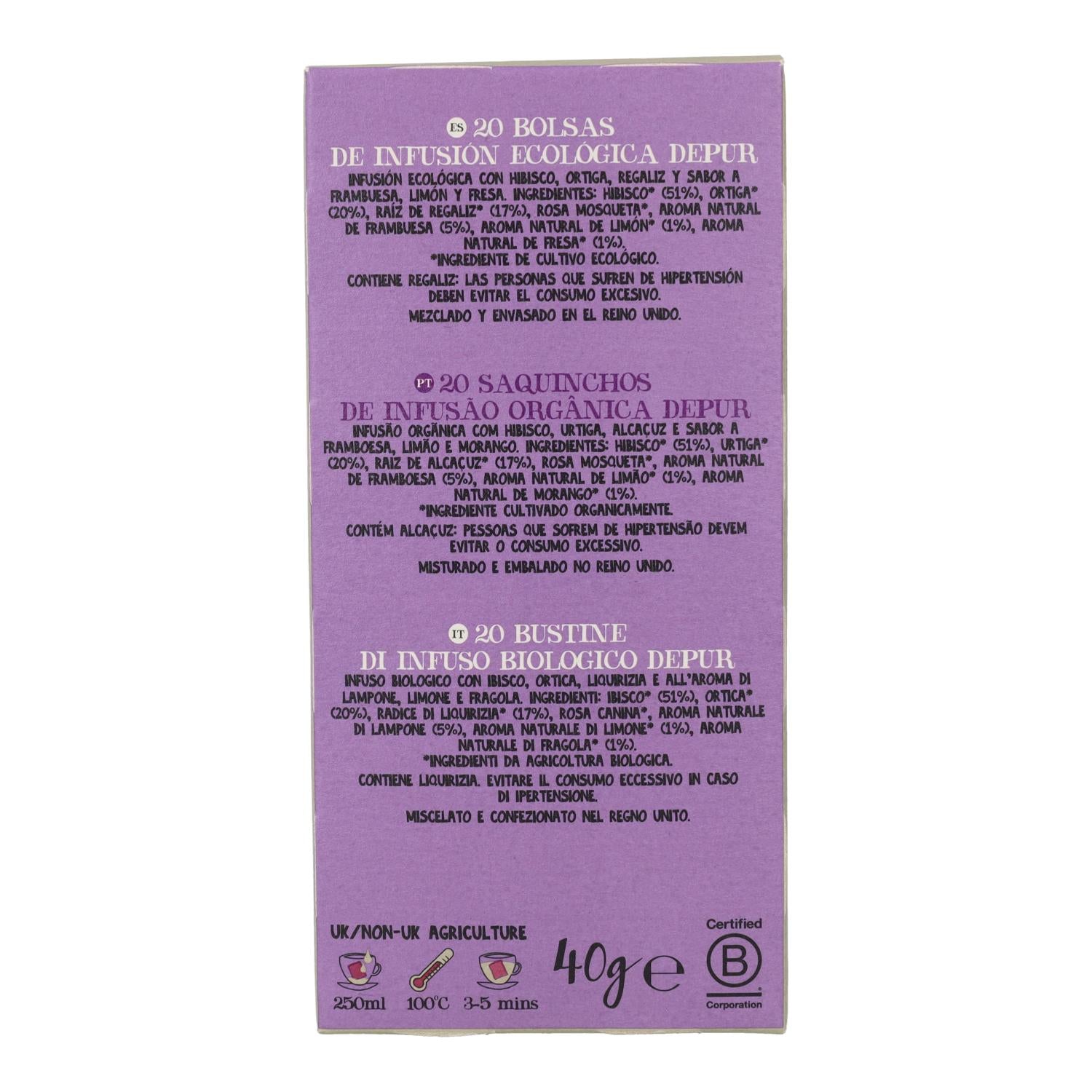 La Infusión Depur BIO de Cupper es una mezcla de hierbas ecológicas diseñada para apoyar las funciones depurativas del organismo. Con un sabor afrutado y refrescante, esta infusión combina hibisco, ortiga y raíz de regaliz, entre otros ingredientes, para ofrecer una experiencia deliciosa y beneficiosa para la salud.