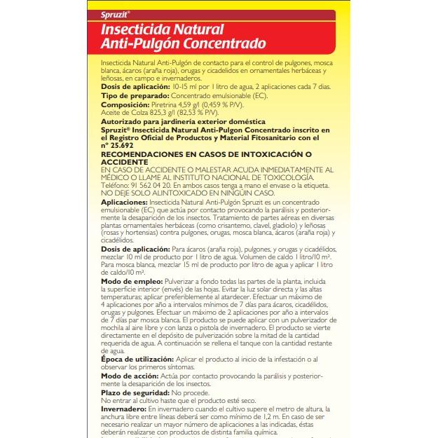 • Sustancias activas: 4,59 g/L de piretrina, proveniente de las flores del Chrysanthemum cinerariaefolium, y 825,3 g/L de aceite de colza.