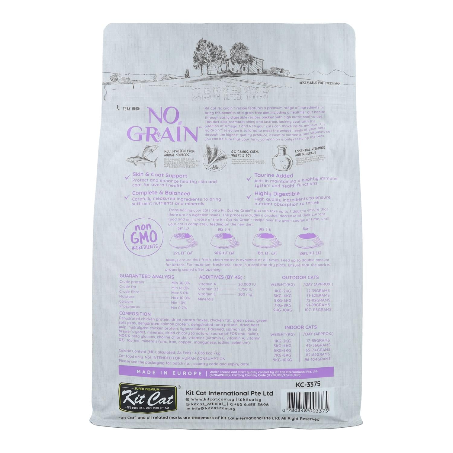 Nuestra receta Kit Cat No Grain de atún y salmón incluye una gama de ingredientes premium para brindar los beneficios a tu gato de una dieta libre de granos. Esto incluye una salud intestinal más saludable a través de recetas fácilmente digeribles llenas de altos valores nutricionales. Esta dieta también promueve un pelaje brillante gracias a la adición de Omega 3 y 6 para que tu gato crezca saludable por dentro y fuera. Nuestra receta No Grain está diseñada para satisfacer las necesidades únicas de tu gato a través de productos de la más alta calidad, nutrientes esenciales y vitaminas para que puedas estar tranquilo de que tu gato solo recibe lo mejor en alimentación para gatos.