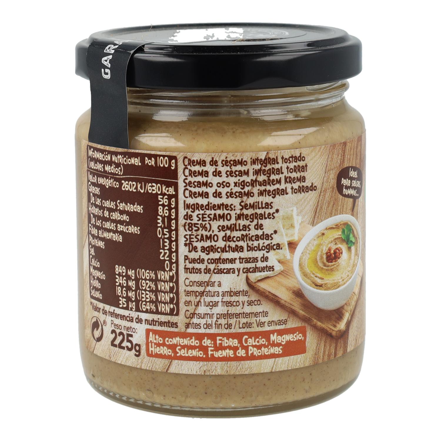 Crema 100 % natural de semillas de sésamo tostadas, procedentes de agricultura ecológica. Sin sal añadida, sin gluten y apta para dietas veganas. Ideal para untar, aliñar o preparar hummus.