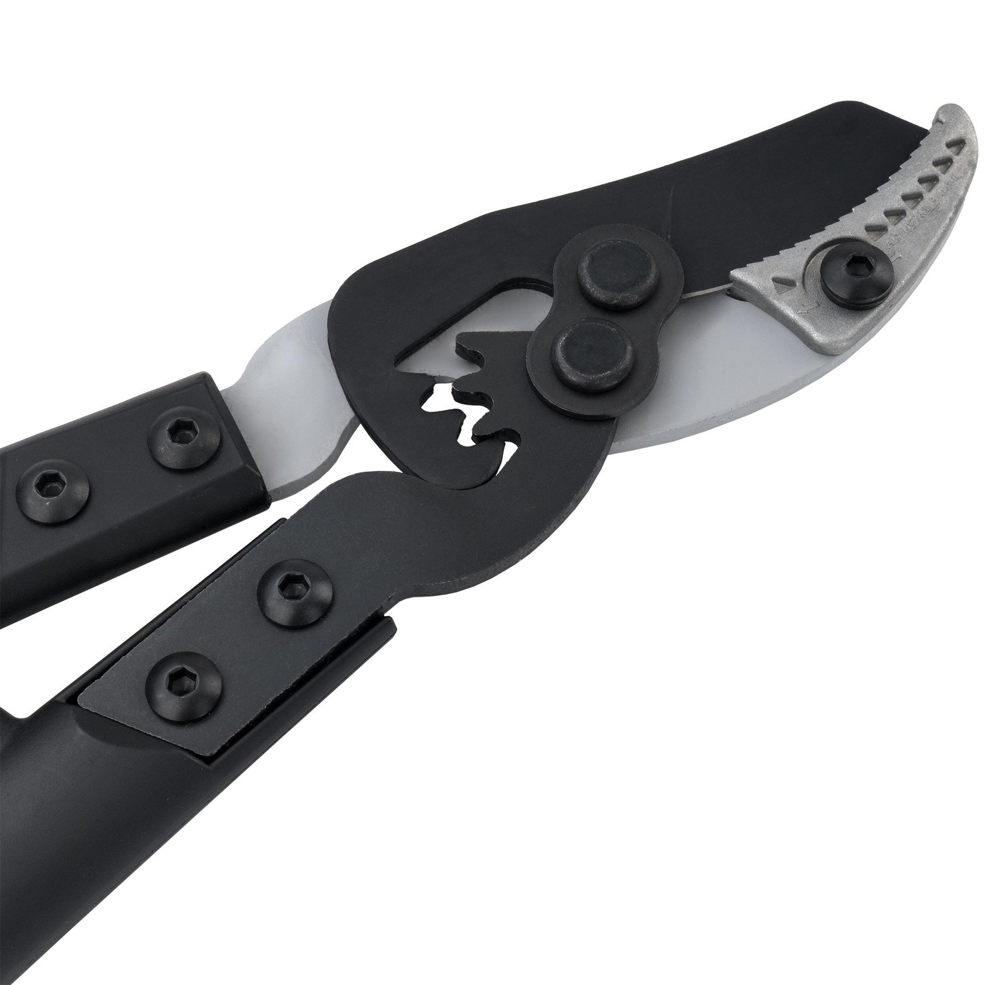 Tijera de dos manos tipo yunque con multiplicador de fuerza, ideal para poda de ramas gruesas, tanto verdes como secas, a diferentes alturas.