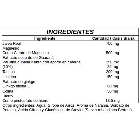 Advertencias: Los complementos alimenticios no deben utilizarse como sustituto de una dieta equilibrada. No superar la dosis diaria expresamente recomendada. Mantener fuera del alcance de los niños más pequeños. Conservar en un lugar fresco y seco. Contiene cafeína (18,75 mg / dosis diaria), no se aconseja su uso en niños, embarazadas o en período de lactancia. Consulte con su médico en caso de toma simultánea con anticoagulantes. No tomar durante el embarazo o la lactancia. Contiene soja.