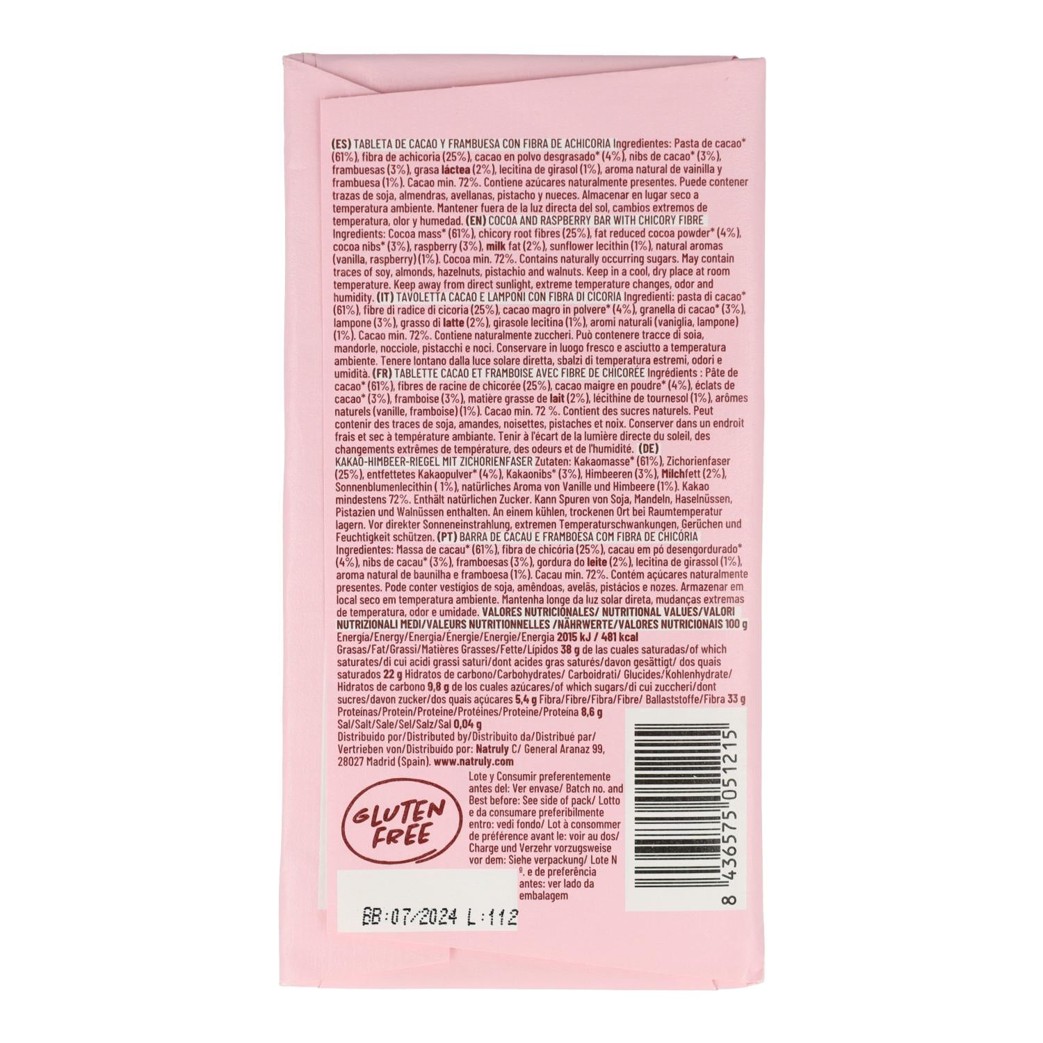 Tableta de Chocolate con Frambuesa y nibs de cacao 100% natural y saludable, sin azucares, sin edulcorantes, sin gluten. Endulzado con fibra de achicoria.