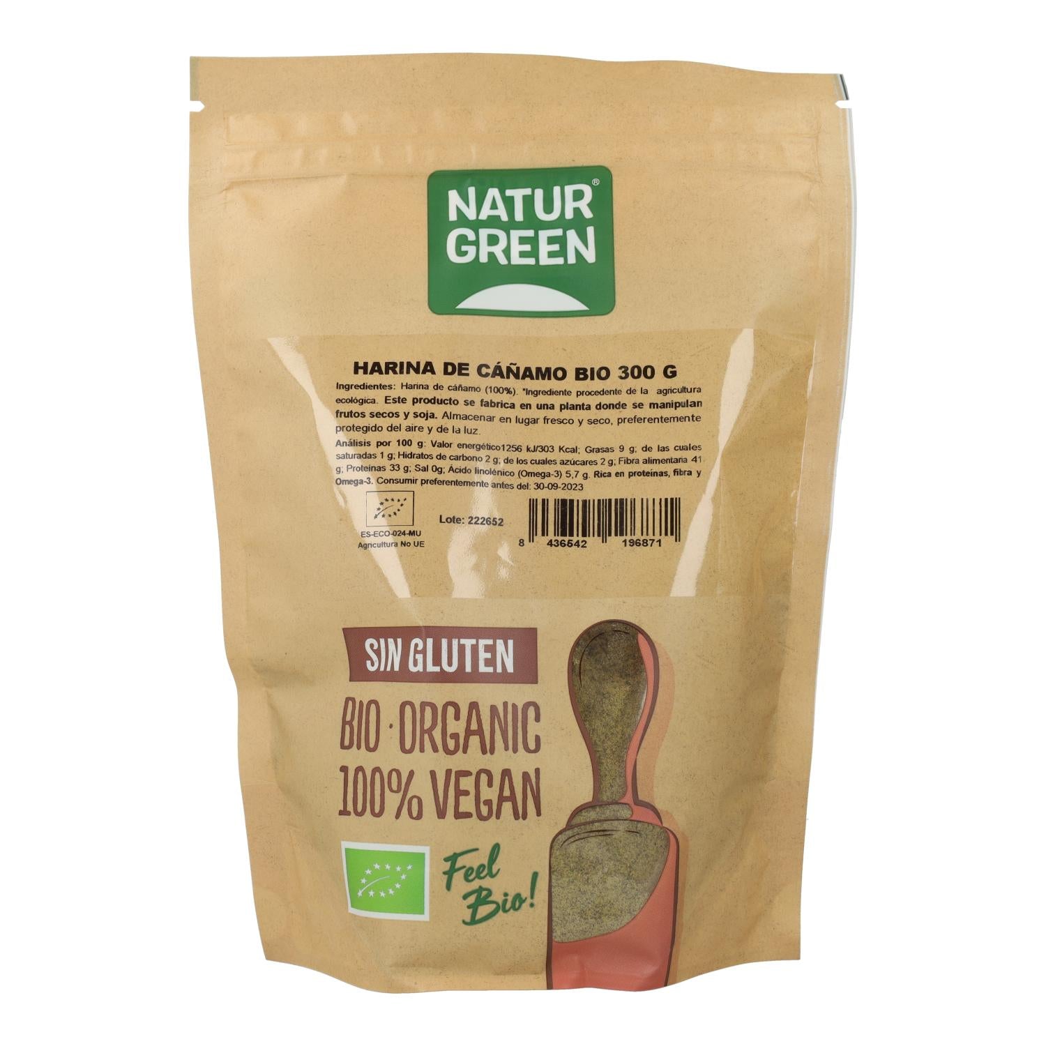 Ingredientes: Harina de cáñamo* (100%).. *Ingrediente procedente de la Agricultura Ecológica. "Este producto se fabrica en una planta donde se manipulan frutos secos, soja y sésamo"