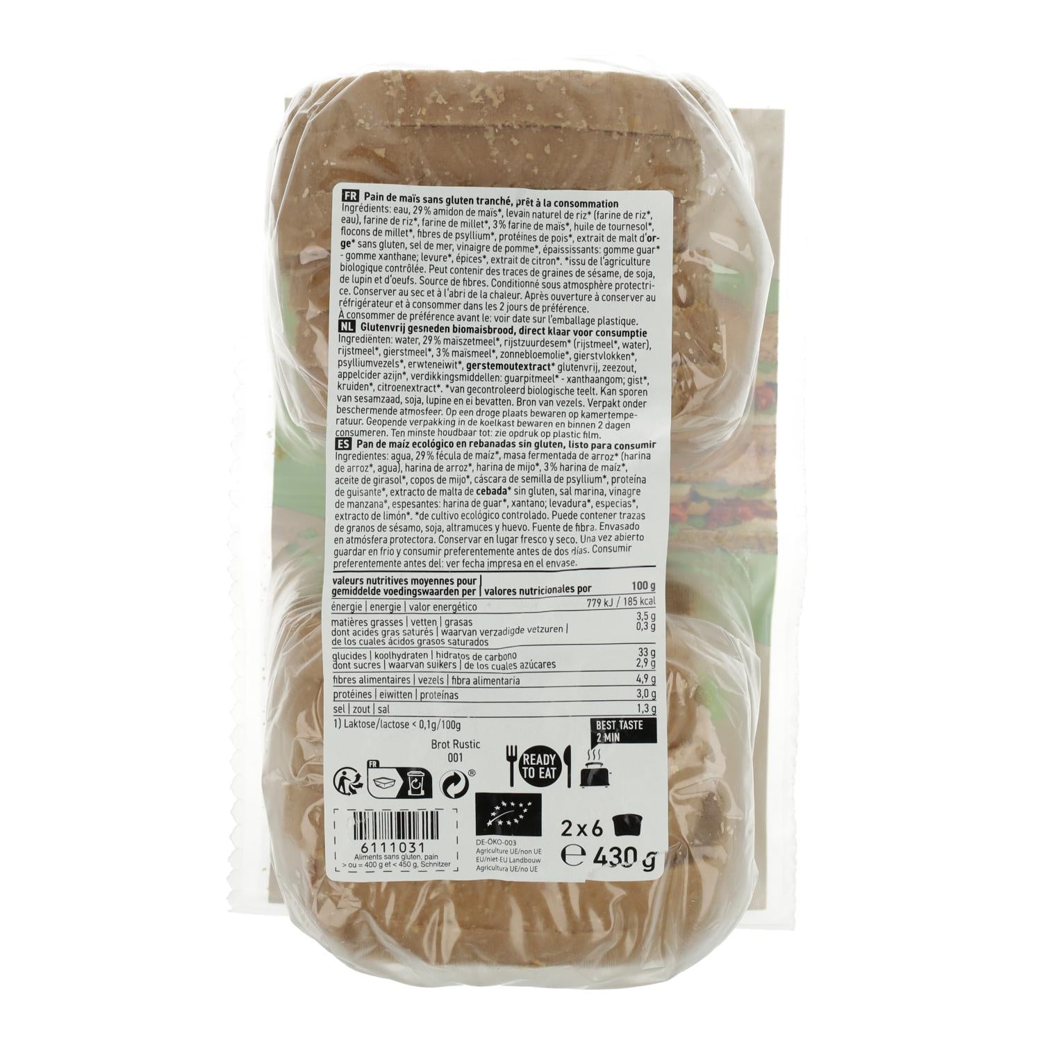 Agua, fécula de maíz* (29%), masa fermentada de arroz* (harina de arroz*, agua), harina de arroz*, harina de mijo*, harina de maíz (3%), aceite de girasol*, copos de mijo*, cáscara de semilla psyllium*, proteína de guisante*, extracto de malta de CEBADA*, dextrosa*, sal marina, espesante: goma guar*, levadura*, especias*, aroma natural. *De agricultura biológica.