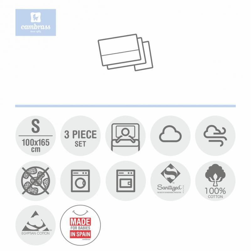 La Sábana cuna 3 piezas pará cuna de 60x120 cm. de Cambrass es de algodón egipcio 100% lo que le aporta un tacto suave.