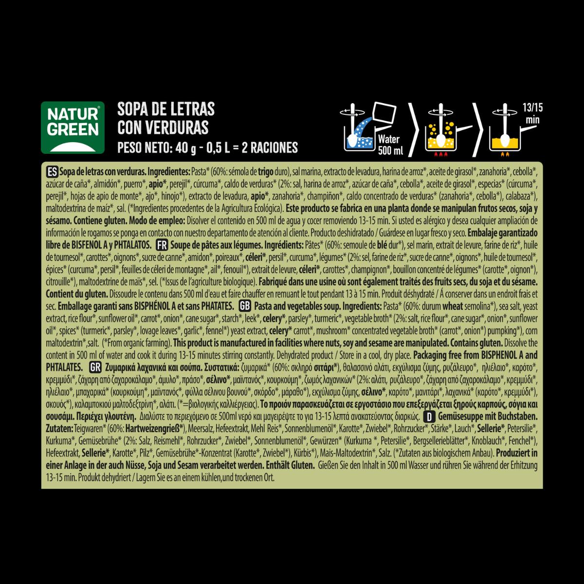 Alle informatie over "Sopa Letras con verdura bio Naturgreen, 40g"