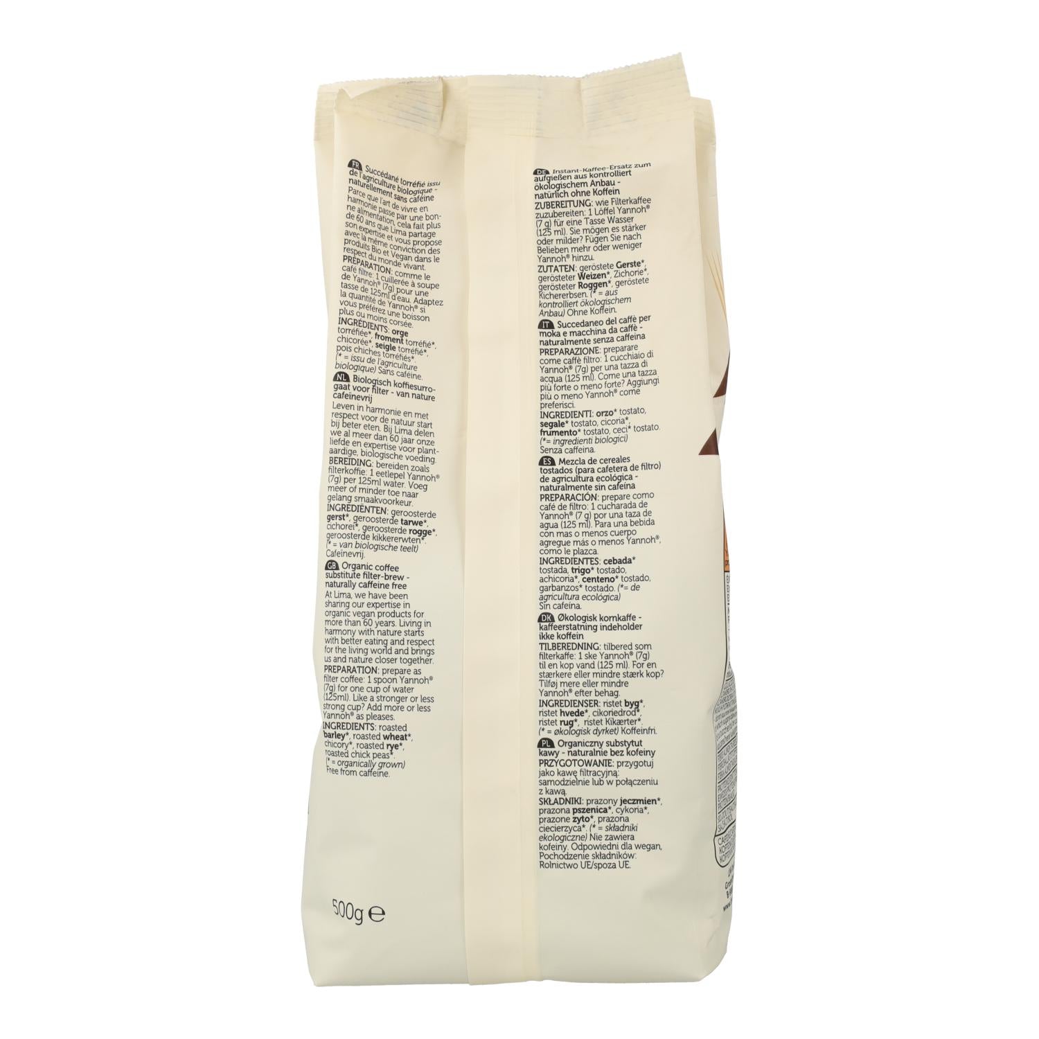 Yannoh Original es una bebida caliente ecológica que sustituye al café tradicional, elaborada a base de cereales tostados y sin cafeína. De sabor suave y equilibrado, esta mezcla se puede preparar en cafetera de filtro, ofreciendo una experiencia reconfortante y saludable para quienes desean evitar la cafeína sin renunciar al ritual del café. Ideal para tomar en cualquier momento del día.