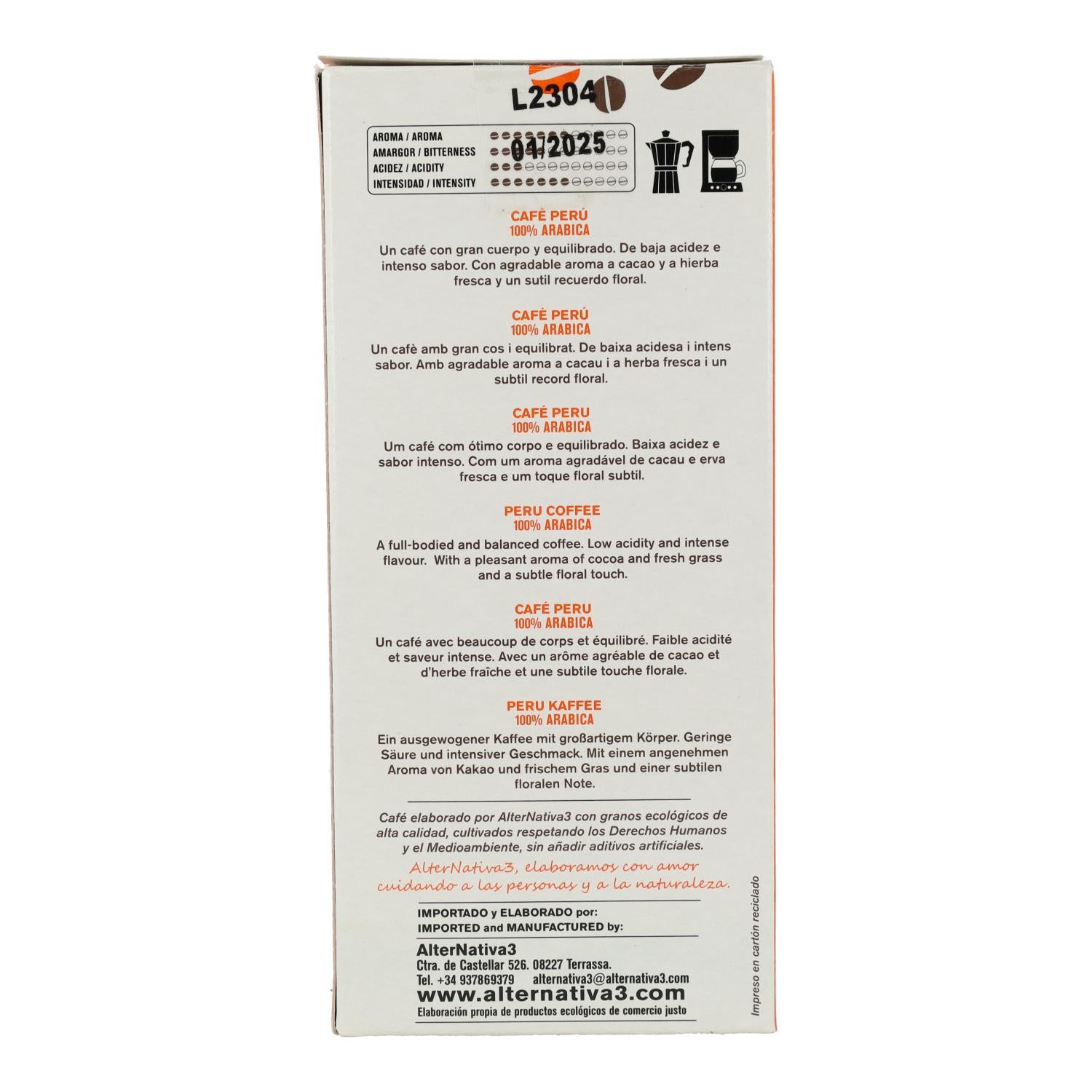 El Café Perú Molido Bio Alternativa 3 es un café ecológico 100% Arábica, cultivado en las alturas de Perú bajo prácticas de comercio justo. Este café destaca por su tueste natural que preserva su sabor auténtico y su aroma característico.