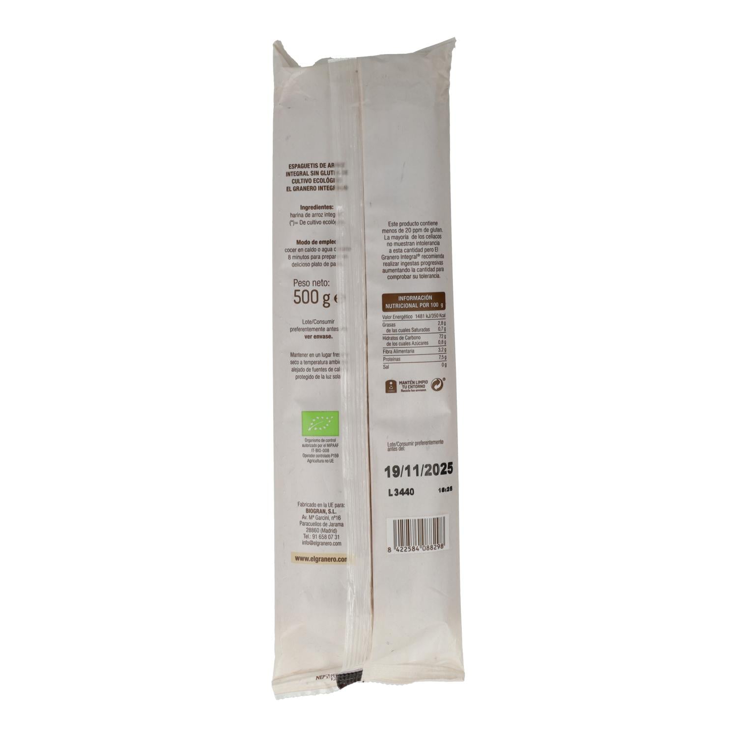 Espaguetis de Arroz Integral Sin Gluten El Granero, 500 g