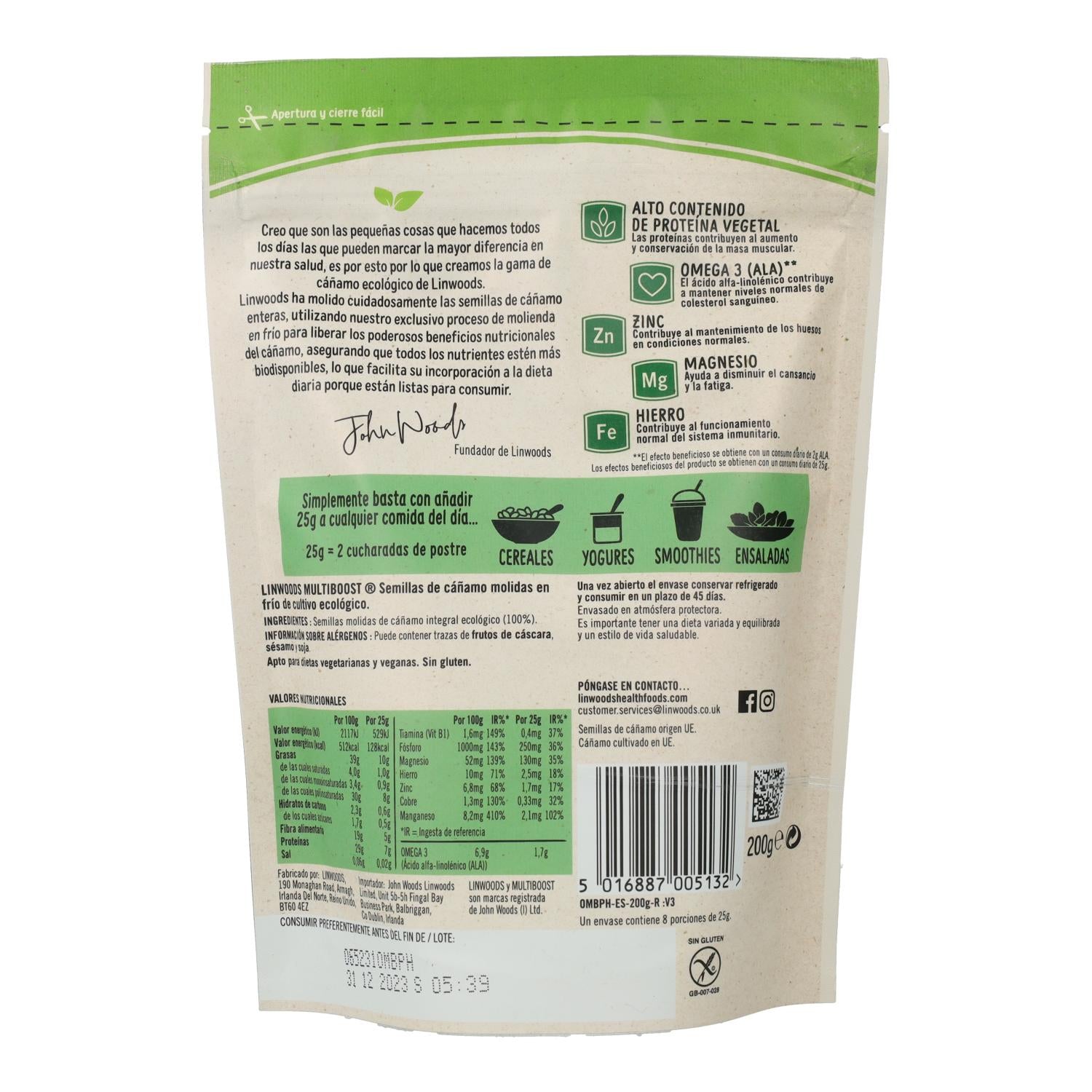 All information om "Semillas molidas de cáñamo bio Linwoods 200 g"